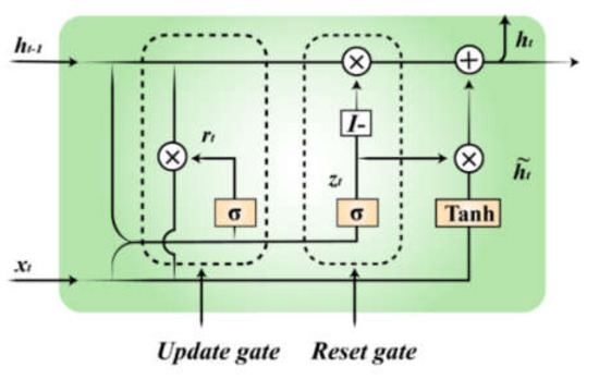 LSTM network is a recurrent neural network (RNN) architecture that can learn order dependency in nonlinear sequence prediction problems [30]. A Gated Recurrent Unit (GRU) network is an improved network model based on the optimization of the three gate functions of LSTM. The forgetting gate and input gate are integrated into a single update gate, and the neuron state and hidden state are mixed at the same time. GRU network can effectively alleviate the problem of “gradient disappearance” in the RNN network, reduce the number of parameters of the LSTM network unit, and shorten the training time [31]. The basic structure of the GRU network is shown in Figure 3, and the specific mathematical description is shown in Equation (2).