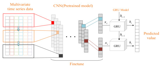 In this paper, the main architectures are a convolution neural network based on transfer learning and GRU. Firstly, temperature and wind speed data of existing stations were extracted by the CNN network combined with transfer learning to construct feature vectors of time series. Then the results are input into the GRU model for training, and the parameters in the network are updated and optimized by the optimization algorithm. The basic structure of CNN—GRU combined with transfer learning is shown in Figure 6 below.