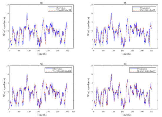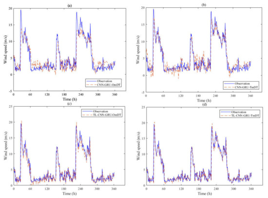 Similar to the experimental content of site 1, Figure 8a,b is wind speed predictions based on the CNN combined with the GRU model. From this figure, we can see that the model of Figure 8a cannot predict the data well, either at the peak point of a wind speed or in the area with dense wind speed. This is due to the low long-term fluctuation of wind speed at site 2, with only a few days prone to strong winds. Therefore, it is more difficult to learn the wind speed characteristics of site 2, and it is difficult for CNN—GRU to learn the wind speed characteristics of this point by using the wind speed data of one month. Compared with Figure 8a, the wind speed prediction effect of Figure 8b is slightly better, but there is still a significant deviation from the real wind speed data. Figure 8c,d is CNN combined GRU models based on transfer learning respectively. It can be seen that the model can well predict the wind speed in the target region, even when the wind speed value is large. In practical engineering applications, the model has good performance. The following Table 3 gives the evaluation indexes of different models.