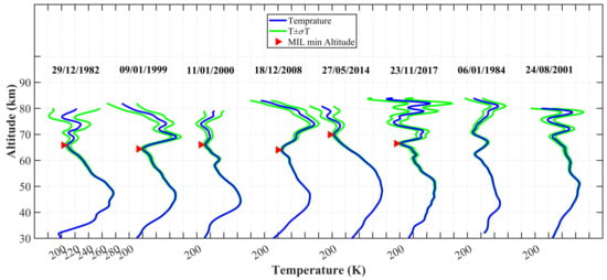 For the present study, the data have been processed using the V6 version of the Temper code developed by LATMOS []. The nightly mean profiles from 30 to 90 km have been smoothed over 3 km and interpolated every 1 km are used. The mean thermal profile of the mesosphere is characterized by a regular temperature decrease from the stratopause around 50 km up to the mesopause around 90 km. However, the temperature profiles obtained by Rayleigh lidar in the south of France frequently exhibit near 65 to 70 km a temperature inversion. Examples of nightly mean vertical temperature profiles from the OHP lidar since 1982 have been shown in Figure 1. These temperature profiles indicate temperature inversion layers with different vertical behaviors. The temperature uncertainties have been reduced by vertical and time integration and have been derived with 3 km effective vertical resolution and one sigma error. MILs in the mesosphere, are characterized by a minimum temperature around 60–70 km, with a strong positive gradient above, and a secondary maximum higher up.