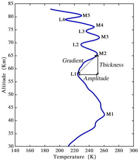 Previous studies Hauchecorne et al. [] already show mesospheric temperature inversions with the OHP lidar and the first statistical characteristics of the mesospheric inversion. In the middle and lower mesosphere, MILs occur at altitudes ranging from 55 to 75 km in winter and 70 to 83 km in summer. Some specific characteristics of MILs such as amplitude and thickness can appear to be similar to other temperature perturbation forcing such as gravity waves or planetary waves. However, MILs tend to persist for several hours to a few days, their vertical extent spans several kilometres, and they can have significantly larger amplitudes compared with gravity waves []. However, the exact range of these characteristics is not well-defined. In the examples provided in Figure 1, such a complex issue is obvious. In addition, several MILs can be observed simultaneously. The amplitude of an inversions layer was defined by Leblanc and Hauchecorne [] as the temperature difference between the top and bottom of the inversion layer. The thickness of the inversion layer is the difference between the altitude of the temperature at the top and the altitude of the temperature at the bottom. Therefore, the top and bottom of the inversion layer by the maximum and minimum temperature peaks need to be defined. The bottom part of the MIL is defined as the closest minimum temperature of the ith layer, while the top part is defined by the maximum temperature, as illustrated in Figure 2.