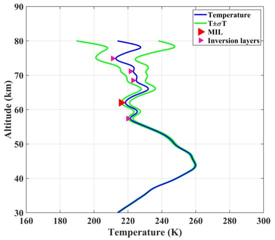 Temperature profile illustrating the detection of different atmospheric layers that could be associated with a MIL on 4 January 2000. The measurement uncertainty for the temperature profile is indicated by the green lines. Potential MILs’ minimum altitudes are indicated by the red and pink triangles. The red triangle corresponds to the bottomside of the layer, which passed all tests and was classified as an MIL.