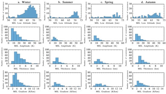 Histogram of the occurrence of MIL characteristics (amplitude, minimum altitude, thickness, and gradient) by season.