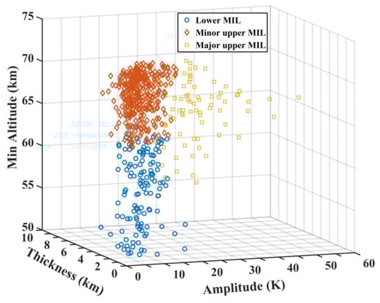 The present study analysis for 42 years of MIL observations, by using the clustering results, tried to classify the characteristics responsible for MIL. In the following, the clustering results reveal three significant MIL groups (Figure 5). The first group with denser data is determined by characteristics such as the minimum height with a maximum peak at 65 km, with a mean amplitude of 9 K, and a thickness between 1 and 6 km with a mean of 3 km (Lower MILs). The second group, minor upper MILs, is located in the middle height range (63–84 km) and has a greater amplitude range in comparison with group 1, from 2 K to 26 K. In addition, the thickness range is larger by 2 to 9 km. Group 3, with more scattered data than the previous two groups, is located in the same altitude range in comparison to group 2, but amplitude is larger than two previous groups (27–60 K) called major upper MILs. The different clusters show significant differences in their amplitude. The first cluster is significantly lower in altitude than the two others. However, similar thicknesses between Groups 2 and 3 are observed, with slightly thicker MILs than group 1. The seasonal behavior of the MIL occurrence shows a full annual cycle for the three categories, with a maximum in winter and a minimum in summer by a factor of 6. Based on the results of each MIL’s group characteristics that are classified in Table 3, an average of 10.9 K amplitude with 3.1 km thicknesses for Lower MILs calculated in the mean minimum altitude at 57.5 km can be mentioned. However, the mean range values of amplitude for the major upper MIL (27.5 K) are very different from the lower MIL (10.9 K) and the minor upper MILs (10.3 K) values. The overall thickness of major upper MIL and minor upper MIL appears somewhat is evident at first glance that the thickness of major upper MIL (4.5 K) is significantly greater than the other two layers.