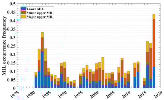 Annual histogram of the MIL occurrence frequency from 1978 to 2019.