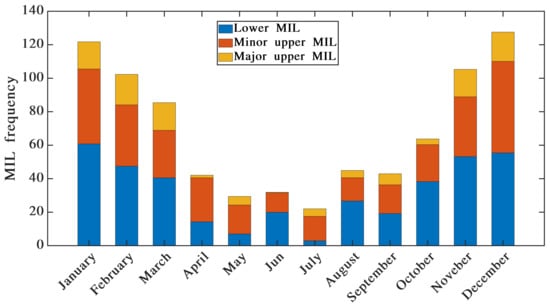 According to Table 2, the highest MIL detection ratio is observed during the winter months of December, January, and February (19.07%, 29.18%, and 18.71%, respectively). In contrast, the minimum occurs in the late spring and early summer months of April, May, and June (4.33%, 6.25%, and 6.13%, respectively). March as well as late summer and autumn appear more transitional, having neither maxima nor minima.