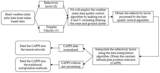 Not only does the new generation of weather radar detect the meteorological targets, but it detects the non-meteorological targets. The quality of weather radar echo data has a direct impact on the extrapolation experiments. The main factors affecting the quality of data are the ground clutter and noise clutter. These two kinds of clutter will affect the performance of radar echo measuring the precipitation, and the integrity of echo display. They will also affect the feature extraction, target judgment and result calculation in the extrapolation experiment. So, we used the weather radar echo data quality control algorithms to filter this clutter. Then, the data after quality control will be interpolated. The data in polar coordinates will be interpolated into the plane grid. Finally, the interpolated data are normalized and sent to the extrapolation method as input. The flowchart of the data preprocessing is shown in Figure 1: