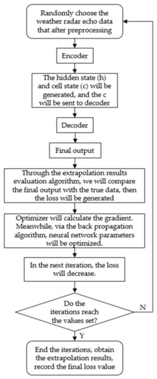 Deep learning is built based on the machine learning algorithms and theories. It is also developed to satisfy the requirements of artificial intelligence [17]. The deep learning model is usually an end-to-end model, under this circumstance, we only need to feed the data and then obtain the output results. So, deep learning does not require very expert professional knowledge for users. In recent years, deep learning has made major breakthroughs in technologies and theories [18], showing excellent abilities in many fields. Through the formulation of an optimization algorithm, the construction of a neural network model and learning or training a large amount of data, the neural network using deep learning algorithms can effectively “learn” the internal correlation of the radar data features in high spatiotemporal resolution sequences, capturing the evolution law and motion state of the radar echo quickly. At present, the near weather forecasting based on deep learning is mainly realized by radar echo extrapolation [19,20,21,22,23]. Compared with CTREC or TITAN, the deep learning model can overcome their disadvantages, tracking and forecasting severe convective weather more stably and more accurately. Additionally, with the development of deep learning, the weather radar extrapolation method based on deep learning has greater potential.