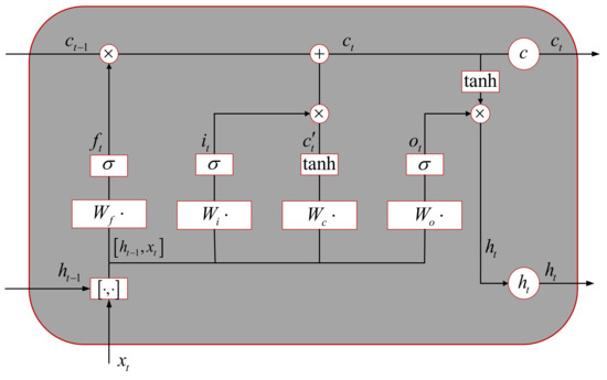 To solve the problem of gradient explosion and disappearance generated by the RNN neural network for long-time prediction, LSTM was built and extended on this basis. LSTM is an upgraded version of RNN invented by Jürgen Schmidhuber in 1997 [32]. It has been proved to have an excellent ability to deal with long sequence problems [33]. The structure of LSTM is shown in Figure 8.