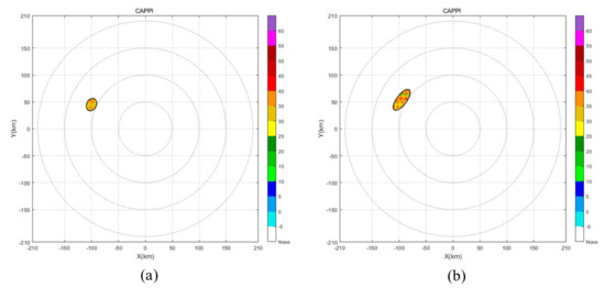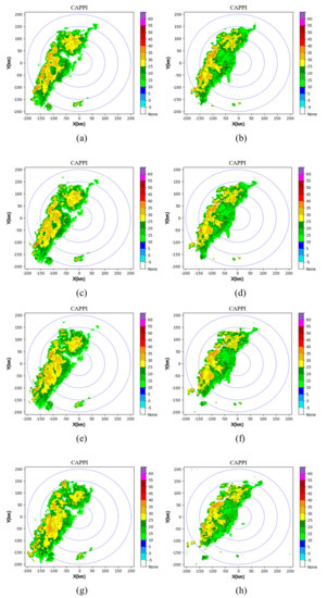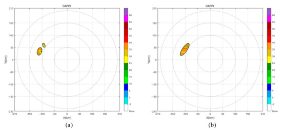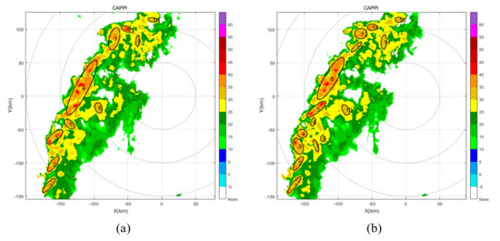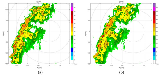 As shown in Figure 11, the ellipses on (a) and (b) are storm cells with a reflectivity factor greater than 30 . The time interval between the two images is 6 min; it can be seen that the number of cells in the two echoes is different.