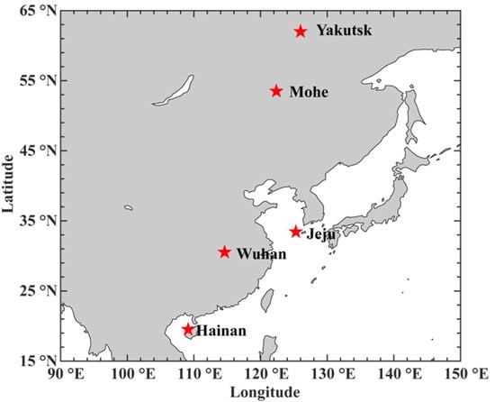 Geographical distribution of Yakutsk, Mohe, Jeju, Wuhan and Hainan.