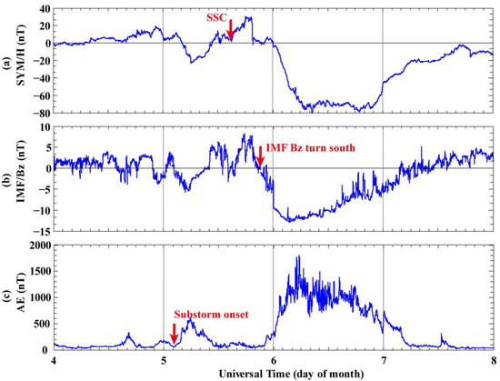 Figure 2a–c show the geomagnetic conditions from 4 July to 8 July 2013, including the SYM-H index, interplanetary magnetic field (IMF/Bz), AE index. We can see from Figure 2a, during this geomagnetic storm event, the sudden storm commencement (SSC) occurred at 14:20 UT on 5 July, and SYM-H reached the maximum of ~30 nT at 19:45 UT on 5 July. Then, SYM-H declined sharply and reached the minimum of ~−80 nT at 06:30 UT on 6 July and remained at the lowest level for a long time, almost for 16 h. After the main phase, the geomagnetic event started to recover at 22:00 UT on 6 July and the SYM-H value recovered to around 0 nT at 18:30 UT on 7 July. Figure 2b demonstrates IMF/Bz turned south at 20:15 UT on 5 July. That IMF/Bz turns south indicates the momentum transfer from the solar wind into the magnetosphere of earth increase obviously. It is worth noting that the AE index variation, as shown in Figure 2c, based on high-latitude magnetograms, represented enhanced substorm activity that began at 00:00 UT on 5 July, just before the geomagnetic storm we studied, and lasted for about 10 h.