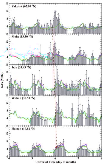 As seen in Figure 4, sequential enhancements of Es layers were observed in latitudinal distributed ionosondes in the Eastern Asian sector over this minor geomagnetic storm. Comparing with mean and median value, the size of the enhanced Es layers during the geomagnetic disturbed period is 3–10 MHz. As widely known, the generation of Es layers is attributed to neutral wind dynamics in the MLT region [1,2], therefore wind is one of the dominant factors that determines the intensity of Es layers.