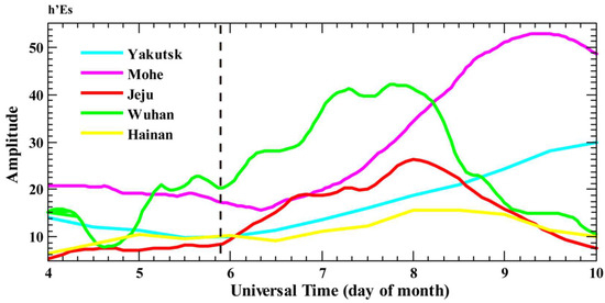 The altitude descent of Es layers is attributed to the global tidal wind system in the MLT region [15]. This means that Es height is a good indicator to demonstrate the tidal influence on Es layers. Figure 5 illustrates the amplitude spectrum of h’Es calculated by Lomb–Scargle analysis for the period of 12 h at different stations. The black dash line indicates the onset of the storm. As seen from Figure 5, semidiurnal amplitude in h’Es shows obvious enhancement after the storm onset, which means the enhanced tidal modulation on Es.