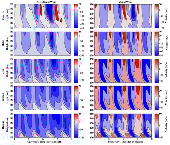 Simulation of wind using TIE−GCM model at the height from 100 to 150 km. The left row is for meridional wind, and the right row is for zonal wind.