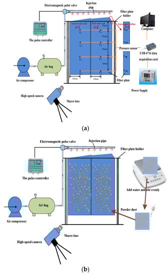 In the dust stripping rate test experiment, we dried the collected dust before the powder attachment experiment started. As shown in Figure 1b, we used an electronic balance to weigh a certain amount of dried dust and added a certain amount of water according to the required dust moisture content, then applied it to the NSMMFP surface after full mixing. We placed the ash hopper and turned on the air compressor to inflate the air bag; when the pressure in the air bag reached the required injection pressure, the injection was carried out. After the injection was completed, the dust collected in the ash hopper was weighed, and the dust stripping rate of the new filter was calculated. In the dust stripping process observation experiment, we took 5 g of wet, evenly stirred, dust and smeared it on the surface of the filter plate, adjusted the lens of the high-speed camera to make the powder area at the center of the shooting area, and shot the whole process of dust stripping during pulse injection. In order to avoid errors caused by experimental equipment and other reasons, each group of working conditions was tested three times and the average value was calculated.