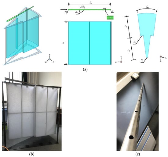 This article studies the dust cleaning performance of the NSMMFP, which is completed on the pulse cleaning test bench, as shown in Figure 1. Figure 1a shows the experimental device diagram and system schematic diagram of the wall surface peak pressure test and Figure 1b shows the device diagram and schematic diagram of the experimental with the powder attached. The NSMMFP applied in this experiment has a built-in support frame, and the frame is covered with a PTFE-coated filter media, the average pore diameter of which is 5 μm, and the porosity is greater than 80%. The blow pipe is a tapered steel pipe produced by a casting process. The injection pipe is a tapered design using a steel pipe produced by a casting process with 8 injection holes; the injection hole spacing is 155 mm. Figure 2 shows the three-dimensional and physical images of the NSMMFP and its injection tube. The specific parameters are displayed in Table 1. This experiment is made up of pulse cleaning and data acquisition systems, including an air compressor (TJ-1200X3, Zhejiang Fushijing Air Compressor Co., Ltd., Zhejiang, China), an air bag, an LXG-16M pulse controller, a DFM-Z-25S electromagnetic pulse valve, a new structure microporous membrane filter plate, a blow pipe, a filter plate holder, a high-speed camera (i-SPEED 716 type, iX Cameras, Rochford, UK), a pressure sensor, an advantech USB-4716 data acquisition card, and a computer with the LabView software (14.0, National Instruments (NI)) installed.