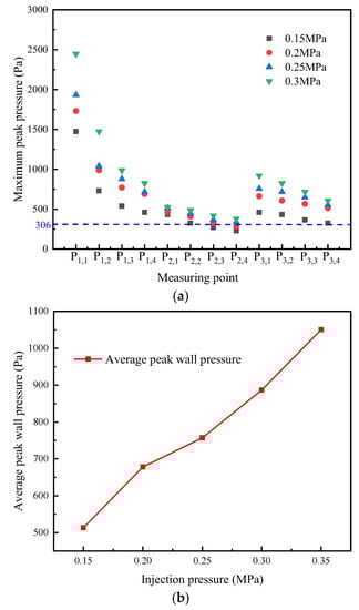 The effect of injection pressure on the wall surface peak pressure. (a) The maximum peak pressure of each measuring point under different injection pressures. (b) The average wall surface peak pressure (AWSPP) of the under different injection pressures.