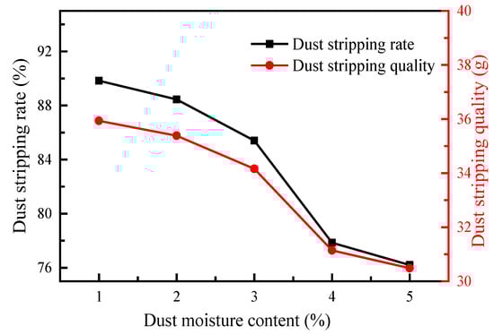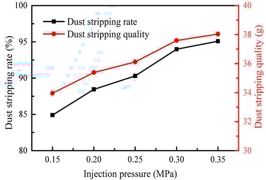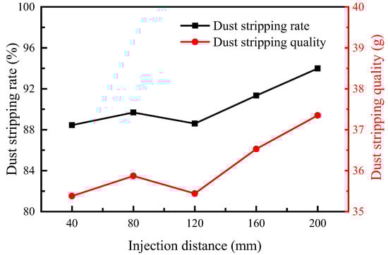 - As the injection distance increases, the dust stripping quality and dust stripping rate show an overall increasing trend. Furthermore, the dust stripping quality and dust stripping rate gradually decrease as the dust quality and dust moisture content increase.