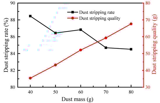 Figure 8 illustrates the change rule of the dust stripping rate of the NSMMFP with the dust quality. The dust stripping rate of the filter plate is on a downward trend as a whole when G increases from 40 g to 80 g, which is from 88.45% to 84.51%. However, when G increased from 50 g to 60 g, the DSR of the filter plate increased slightly. This is due to the increase in dust quality, which causes the thickness and density of the dust layer to increase, which reduces the dust cleaning effect. Zhang et al. [] found that in the research on the dust residue of the flat frame filter cartridge, the greater the quality of the dust layer, the greater the thickness and density, and the greater the residual amount of dust. To sum up, the greater the dust quality, the worse the dust cleaning effect. Therefore, in order to avoid excessive dust on the wall of the filter plate from affecting the normal operation of the dust collector, it is necessary to clean the dust collector in time.