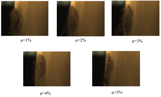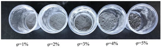 To investigate the influence of the dust moisture content φ on the DSR of the NSMMFP when injection pressure p = 0.20 MPa, injection distance X = 40 mm, and dust quality G = 40 g, the dust stripping rate of the filter plate was studied experimentally at different values of φ. Furthermore, Figure 9 displays the dust particles with different moisture contents.