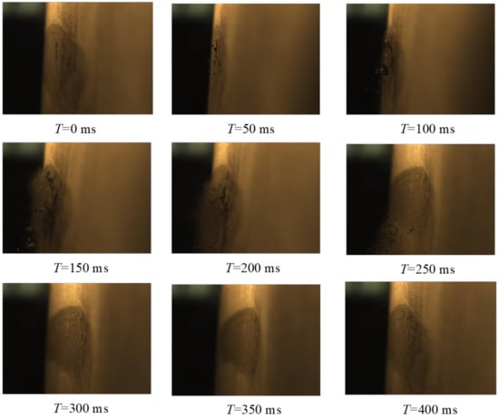 In order to explore the peeling process of dust on the NSMMFP, a high-speed camera was used to shoot the peeling process at injection pressure p = 0.20 MPa, injection distance X = 40 mm and dust moisture content φ = 1%.
