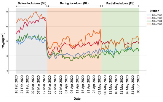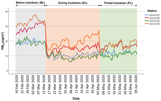 Figure 2 shows the behavior of the daily average concentration of PM in the three periods of 2020 per monitoring station. In the DL period, a decrease of −48.00% was registered with respect to the BL period, and a reduction of −40.00% in the period PL corresponding to the BL period of the same year. However, there is an increase in the concentration of PM of 15.38% in the PL period to the DL period. The lowest concentration levels were recorded at the AQ-IoT-04 station at the monitoring station level in the DL and PL periods, as shown in Figure 2. The AQ-IoT-04 station registered a decrease of −54.54% in the DL period, and the AQ-IoT-05 station had a decrease of −48.57% in the PL period, both decreases corresponding to the level registered in the BL period. When comparing the concentration between the DL and PL periods, increases of 27.27%, 11.76%, and 30.00% were recorded at the AQ-IoT-02, AQ-IoT-03, and AQ-IoT-04 stations, respectively. However, at the AQ-IoT-05 station, a decrease of −10.00% was recorded in the concentration of PM.