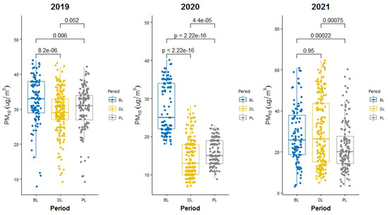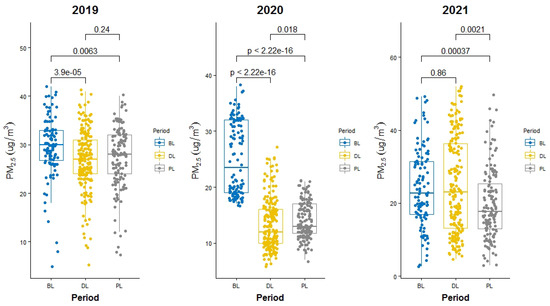 Comparison of PM concentration by period (BL, DL, and PL) and year, using the Wilcox test.