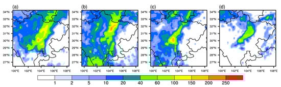 Figure 3a–d), all cases capture the horizontal structure of rainfall well, though the forecasting skill for Case1 is lower than others. However, the center of the predicted heavy precipitation of Case1 is shifting north while a bit south for Case2, Case3, and Case4. We also show the bias of the rainfall forecasts in