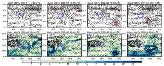 Figure 4, we can find that all the rainfall events occurred with the upper-level (500 hPa) troughs and the Western Pacific Subtropical High (WPSH); however, the synoptic patterns over the lower troposphere (850 hPa) of the four cases are of difference.