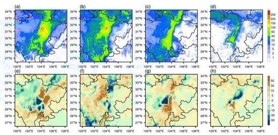 Figure 5e–h. Note that the significant bias is generally located in the areas of heavy precipitation because of the shift of the center of heavy rainfalls. Except for that, the bias ranges from −15 mm to 15 mm in most areas. These results substantiate that the WRF model ensemble has reasonably good forecasting skills in predicting rainfall events over the Sichuan Basin. However, the performance of individual members still needs to be explored.