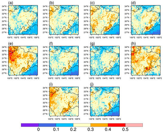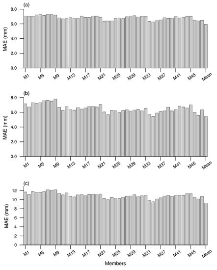 Figure 7 illustrates the four-case averaged MAEs in the three periods. The results indicate that most experimental runs capture the rainfall intensity and spatial distribution well. However, the oblivious variation among individual members can be observed. Relatively large MAE values occur in members associated with the Lin MP scheme, which indicates that the Lin MP scheme may be not appropriate for the rainfall prediction over the Sichuan Basin.