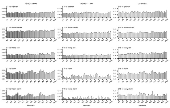 Table 2). Consistent with the RMSE, the ETS of ensemble mean shows better skills than most individuals in 12-h and 24-h cumulative precipitation, especially for the light rain, moderate rain, and storm. It can be found that the variation in ETS values of storm and heavy storm is larger than the variation in other intensities of precipitation during all three periods. Besides, for the storm and heavy storm, better forecasting skills are presented when using the WSM6 MP scheme in combination with the ACM2 PBL scheme (M22–M24), the Goddard MP scheme in combination with the YSU PBL scheme (M25–M27), and the Goddard MP scheme in combination with the ACM2 PBL scheme (M34–M36) during three periods, except for heavy storm during 00:00–11:00 UTC. It should be noted that although the members do not display consistent performance in each magnitude of precipitation, the configuration of parameterization schemes is more sensitive to storm and heavy storm.