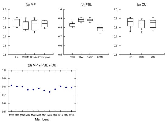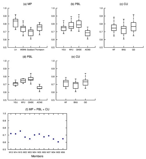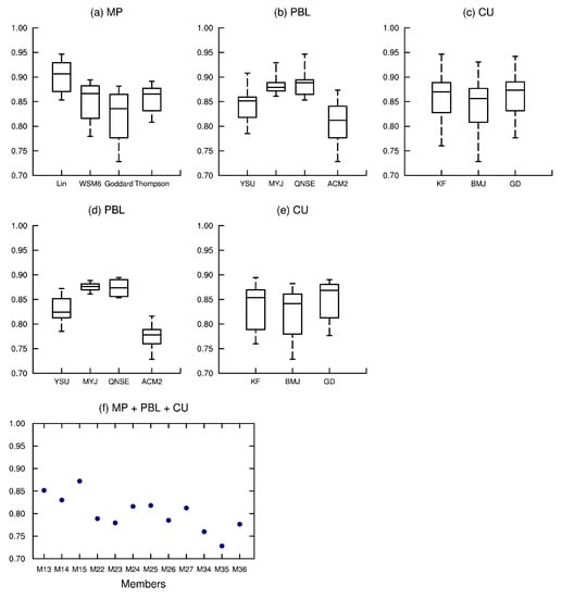 Figure 10), we can find a large overlap of options in MP and CU schemes, which suggests that it is unnecessary to choose them. On the contrary, the YSU and ACM2 PBL schemes have smaller values and less overlap with the other two PBL options; therefore, the members in the second row contain only these two options in the PBL scheme. Although the values of the remaining members vary slightly (