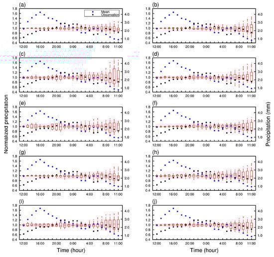 The boxes are drawn based on hourly precipitation normalized by their mean value. It can be seen that although the mean values of the predicted hourly precipitation for each parameter vary slightly, at most moments there are large discrepancies between them and observation. Furthermore, the variation of boxes shows that the effect of each parameter on hourly precipitation is significant, especially for P3, P5, P8, and P9. It is worth noting that almost every parameter is less sensitive from 12:00 UTC to 23:00 UTC than 0:00 UTC to 11:00 UTC, and the last four hours have the greatest variability in hourly precipitation, indicating that the impact of uncertainty in parameters becomes significant with forecasting lead time.