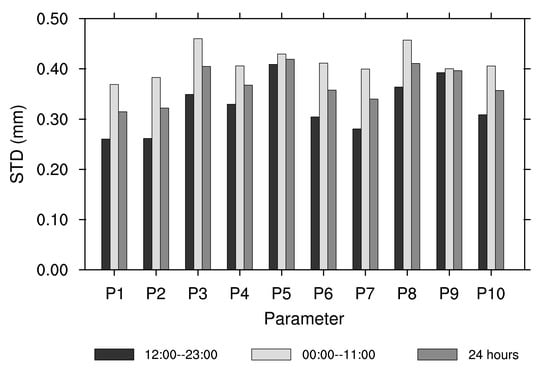 Figure 16, the STD values for all parameters from 0:00 UTC to 11:00 UTC (solid light gray bar) are much larger than that from 12:00 UTC to 23:00 UTC (solid black bar), especially for parameters P1–P3 and P6–P8. The difference between two periods for P9 is minor.