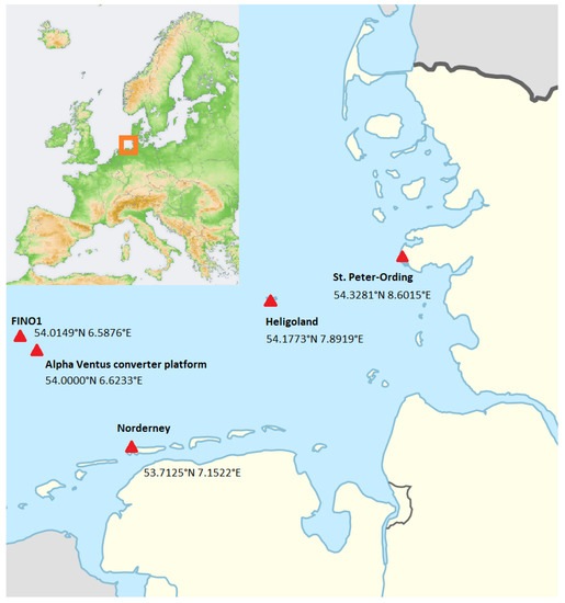 Location of measurement sites of the lidars (St. Peter-Ording, Heligoland, FINO1, Alpha-Ventus, Norderney) [56].