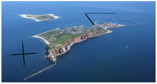 The WLS8-8 system was located at the island Heligoland at the site of the Alfred Wegener Institute, Helmholtz Centre for Polar and Marine Research and almost at sea level (2 m) from 24 March 2017 to 23 March 2018. The data availability, defined as the percentage of wind profiles where at least half of the data points of the wind profiles were valid, was 98.5%. Since no wind farms are in close proximity to the island, only the orography of the island itself alters the wind field. The island is elevated up to 60 m with 50 m high cliffs in the north (Figure 2). The smaller island “Düne” is located to the northeast of the lidar. This limits the unobstructed wind sector to 90° to 270°, neglecting the flat and narrow southern part of the island. The site will be referred to as HL.