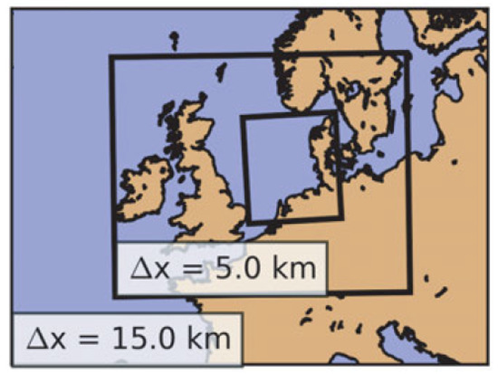 In the framework of the project WIPAFF [4], airborne in situ meteorological measurements were performed with the research aircraft Dornier 128 above the German Bight [53]. During the flight on 2 June 2017, a low-level jet was measured in parallel with the wind lidar systems. For this particular day, simulations with the weather research and forecasting (WRF, 3.8.1) model were performed to validate the model performance in the case of an LLJ and to complement the lidar and airborne measurements for studying the horizontal extent of the phenomenon. The full details of the numerical setup are described in [57]. However, the effect of wind farms is not parameterized here, as the focus is the evolution of LLJs. The model has three domains with horizontal grid sizes of 15 km, 5 km, and 1.6 km, respectively (Figure 3). All domains have the same vertical levels, below 200 m the spacing of the vertical levels is 35 m, whereby the lowest full level is located approximately 20 m above MSL. The initial and lateral boundary conditions are defined by operational ECMWF (European Centre for Medium-Range Weather Forecasts) analysis data, having a horizontal grid size similar to the outermost domain. The model is initialized at 12:00 UTC on 1 June 2016, resulting in 18 h spin-up time. The model uses the following parameterizations in all three domains: the WRF double-moment six-class cloud microphysics scheme (WDMS [58]), the rapid radiation transfer model for GCM (RRTMG) scheme for short- and longwave radiation [59], the Noah land surface model [60] and the Mellor–Yamada–Nakanishi–Niino (MYNN) boundary layer parameterization [61] with a modified mixing length in the free atmosphere [62]. The outermost domain uses a cumulus parameterization [63], whereby the two innermost domains have a convective allowing grid size.