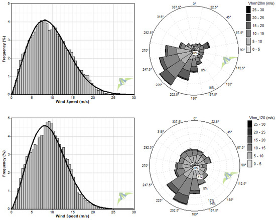 The Weibull wind speed distributions at Heligoland and Norderney (Figure 4), at a representative hub height (120 m), are similar: The scale factor, which is proportional to the most likely wind speed, is A = 10.91 m s for Heligoland and 10.39 m s for Norderney. This is in agreement with typical long-term values in the North Sea obtained at FINO1 [33]. The shape factor is k = 2.12 for Heligoland and 2.33 for Norderney, which are typical values for the German Bight [33]. The wind roses are similar as well. However, the most frequent wind direction for Heligoland was SW, and for Norderney SSW. Note that the data were obtained during different years. Therefore, the differences may be attributed to generally different prevailing wind conditions in the different years, or to systematic differences due to different locations.