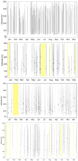Occurrence and altitude distribution of the LLJ events averaged over each day that were observed by wind lidar at Heligoland from 24 March 2017 to 23 March 2018 (first figure), and determined by radiosonde profiles at Norderney from 24 March 2017 to 23 March 2018 (second figure), observed by wind lidar at Norderney from 9 August 2019 to 8 August 2020 (third figure), and by radiosonde profiles at Norderney from 9 August 2019 to 8 August 2020 (lower figure). The altitude interval affected by the LLJ is marked by a vertical black line. Maximum wind speed is marked by a black dot. Yellow areas show intervals with no valid data.