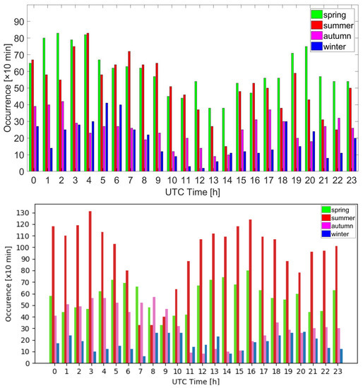 Total number of LLJ occurrence (10 min averages) in spring (green: March, April, May), summer (red: June, July, August), autumn (magenta: September, October, November) and winter (blue: December, January, February) at Heligoland (upper figure) and Norderney (lower figure) for each hour of the day in UTC based on wind lidar data.