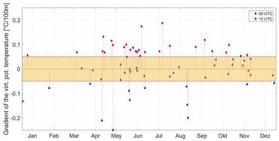 LLJ events depending on the vertical gradient of the potential temperature based on radiosonde data from 9 August 2019 to 8 August 2020. The radiosonde ascents at midnight are indicated by a blue symbol, and the ascents around noon by a red symbol. The yellow horizontal bar indicates an (arbitrary) range of very small changes in virtual potential temperature, separating cases with clearly stable conditions (above) and clearly unstable conditions (below).