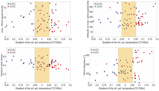 For the radiosonde data set, temperature and humidity data are available as well. Figure 7 shows the vertical gradient of the virtual potential temperature, which is an indicator of atmospheric stability, for the individual LLJ events. There is a trend that LLJ events observed around noon occurred mostly during stable conditions. At midnight, LLJ events are observed most frequently for neutral or even unstable atmospheric conditions.