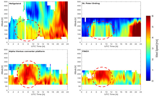 Time series of the lidar wind profiles for the sites Heligoland, St. Peter-Ording, Alpha Ventus and FINO1 on 2 June 2017. The locations of the wind lidar systems are provided on the map (Figure 1). The LLJ event (marked in red) during the time of the measurement flight is visible at all sites.