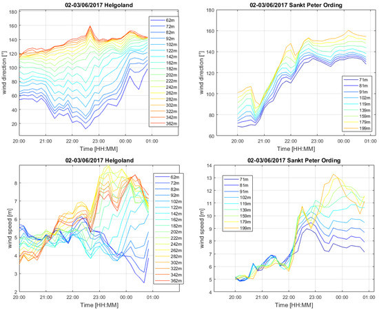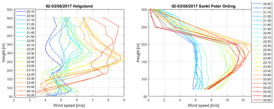 On 2 June 2017, a day with southeasterly wind directions, water temperatures from 12 °C in the central German Bight up to 17 °C along the coastline, and air temperatures from 13 °C in the central German Bight up to 16 °C over land in northwestern Germany, an LLJ event was observed by four wind lidar systems and airborne measurements near the wind park Amrumbank West simultaneously (Figure 9). Figure 10 additionally shows profiles of a nocturnal LLJ which was established later that day at the locations Heligoland and St. Peter-Ording.