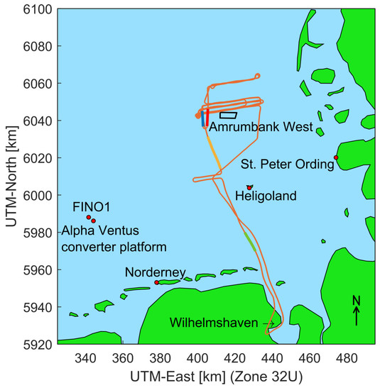 - Bärfuss, K.; Hankers, R.; Bitter, M.; Feuerle, T.; Schulz, H.; Rausch, T.; Platis, A.; Bange, J.; Lampert, A. In-Situ Airborne Measurements of Atmospheric and Sea Surface Parameters Related to Offshore Wind Parks in the German Bight; PANGAEA: Bremen, Germany, 2019. [Google Scholar] [CrossRef]