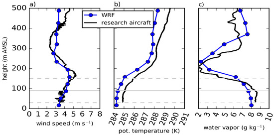 WRF simulations and airborne observations on 2 June 2017 at 09:15 showing: (a) vertical profile wind speed, (b) potential temperature, and (c) water vapour mixing ratio.