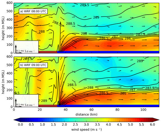 WRF simulation of 2 June 2017 showing the cross section in almost north–south direction, from land to the wind park. (a) shows 08:00 UTC, (b) shows 09:00 UTC. The area above land is indicated in red, up to a distance of 35 km. The lower figure shows the horizontal distribution of wind speed in the German Bight at 100 m altitude.