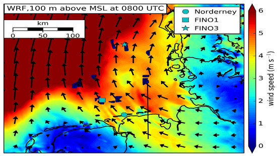 Therefore, the overall extent of the LLJ above the German Bight can be estimated as at least 110 km in the north–south direction (from Wilhelmshaven to Amrumbank West) and 130 km in the east–west direction (from St. Peter-Ording to FINO1) from observational data. This is in agreement with observations above land, where LLJs can extend several hundreds of kilometres in length and width [67]. WRF simulations even suggest a larger extent of up to 170 km in the north–south direction and of at least 260 km in the east–west direction (see wind speed at 100 m altitude in Figure 13).